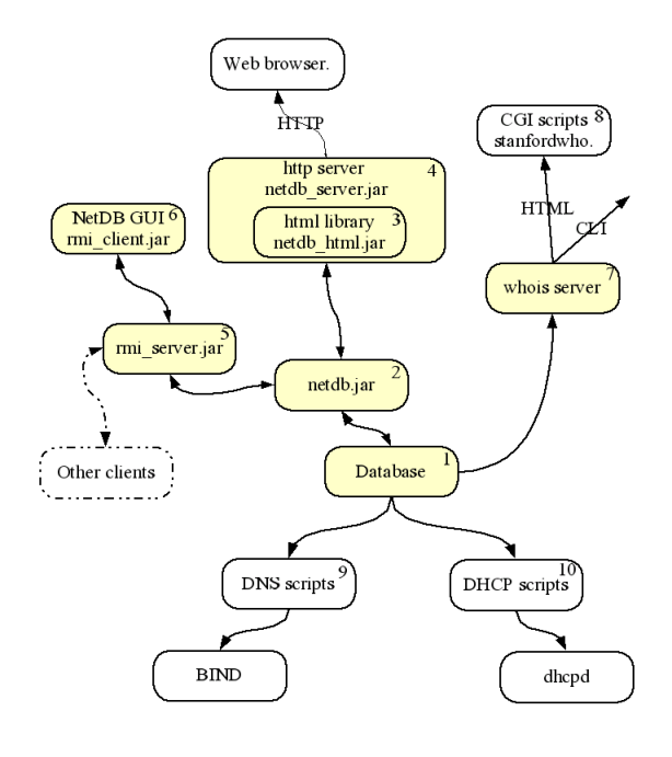 The numbered boxes represent the parts NetDB, not all of them are maintained under one source tree. Parts 8, 9 and 10 maintained separately from the main body. Thus in a more narrow sense NetDB consists of parts 1 through 6.
