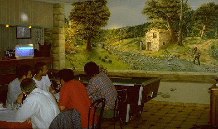 One advantage of fishing this area is that guided fishing includes lunch, potentially at local restaurants, this one in St. Pierreville includes wine (note serious size of carafes on table) and from the mural you can see they take the fishing (and eating seriously). The following streamside lunch is is in the Gorges of the River Loire -- one of the prime fishing spots -- no climbing out of the gorge to go for lunch at the local bistro.