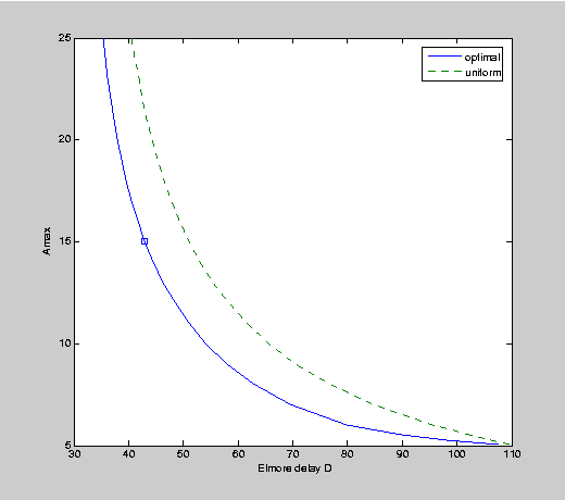 xlabel('Elmore delay D'); ylabel('Amax');