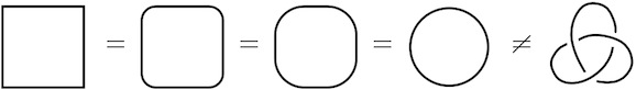 Topology is the study of geometric shapes, with regard only to those properties that are unchanged by stretching and bending. Geometry deals with properties such as distances and angles, which are of course changed if you stretch or bend the objects. In topology we ignore these kind of properties. From the viewpoint of topology, a square is the same as a circle, since you can deform one into the other! On the other hand, if you have a circle in space, you cannot turn it into a trefoil knot without tearing it. Therefore, the circle and the trefoil are topologically different: