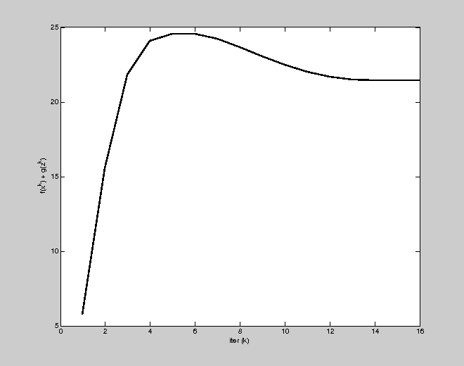 ylabel('f(x^k) + g(z^k)'); xlabel('iter (k)');
