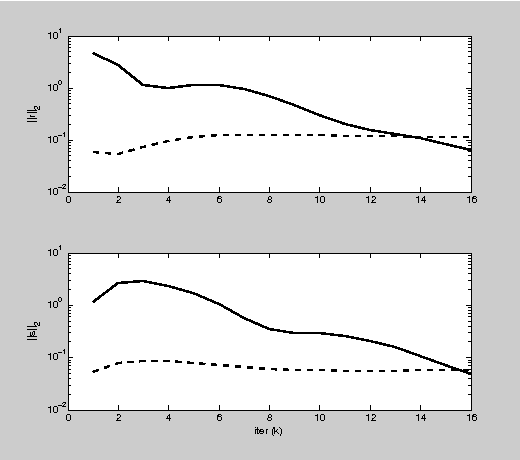 ylabel('||s||_2'); xlabel('iter (k)');