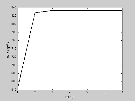 ylabel('f(x^k) + g(z^k)'); xlabel('iter (k)');