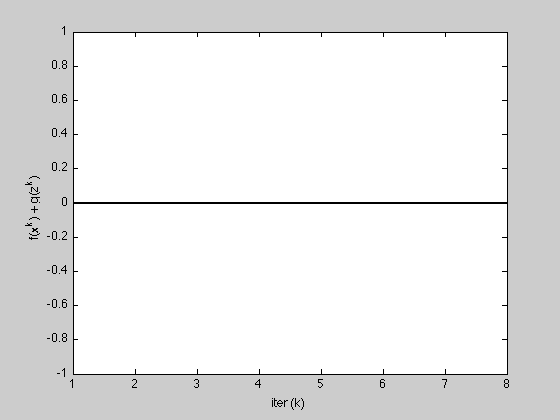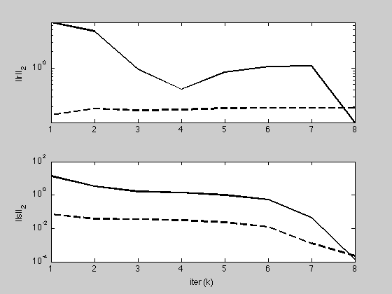 K = length(history.objval); h = figure; plot(1:K, history.objval, 'k', 'MarkerSize', 10, 'LineWidth', 2); ylabel('f(x^k) + g(z^k)'); xlabel('iter (k)'); g = figure; subplot(2,1,1); semilogy(1:K, max(1e-8, history.r_norm), 'k', ... 1:K, history.eps_pri, 'k--', 'LineWidth', 2); ylabel('||r||_2'); subplot(2,1,2); semilogy(1:K, max(1e-8, history.s_norm), 'k', ... 1:K, history.eps_dual, 'k--', 'LineWidth', 2); ylabel('||s||_2'); xlabel('iter (k)');