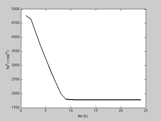 ylabel('f(x^k) + g(z^k)'); xlabel('iter (k)');