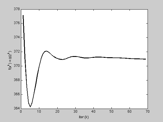 ylabel('f(x^k) + g(z^k)'); xlabel('iter (k)');