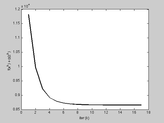 ylabel('f(x^k) + g(z^k)'); xlabel('iter (k)');