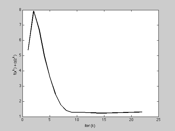 ylabel('f(x^k) + g(z^k)'); xlabel('iter (k)');