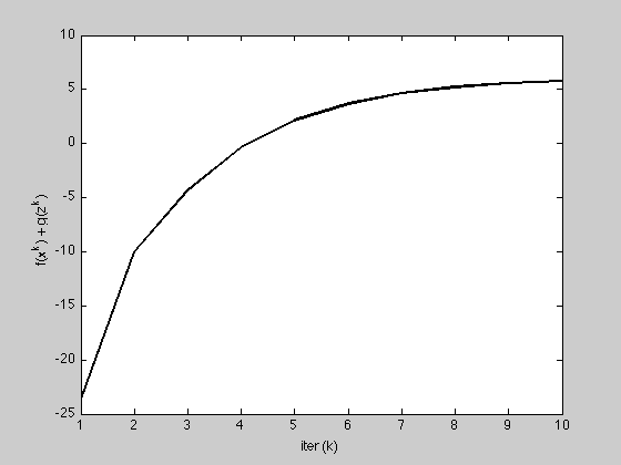 ylabel('f(x^k) + g(z^k)'); xlabel('iter (k)');