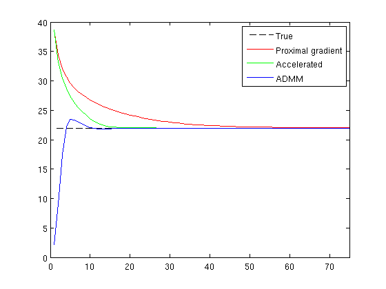 legend('True', 'Proximal gradient', 'Accelerated', 'ADMM');