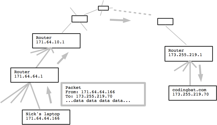 e.g. 171.64.64.110 - Each packet has from: and to: IP addresses