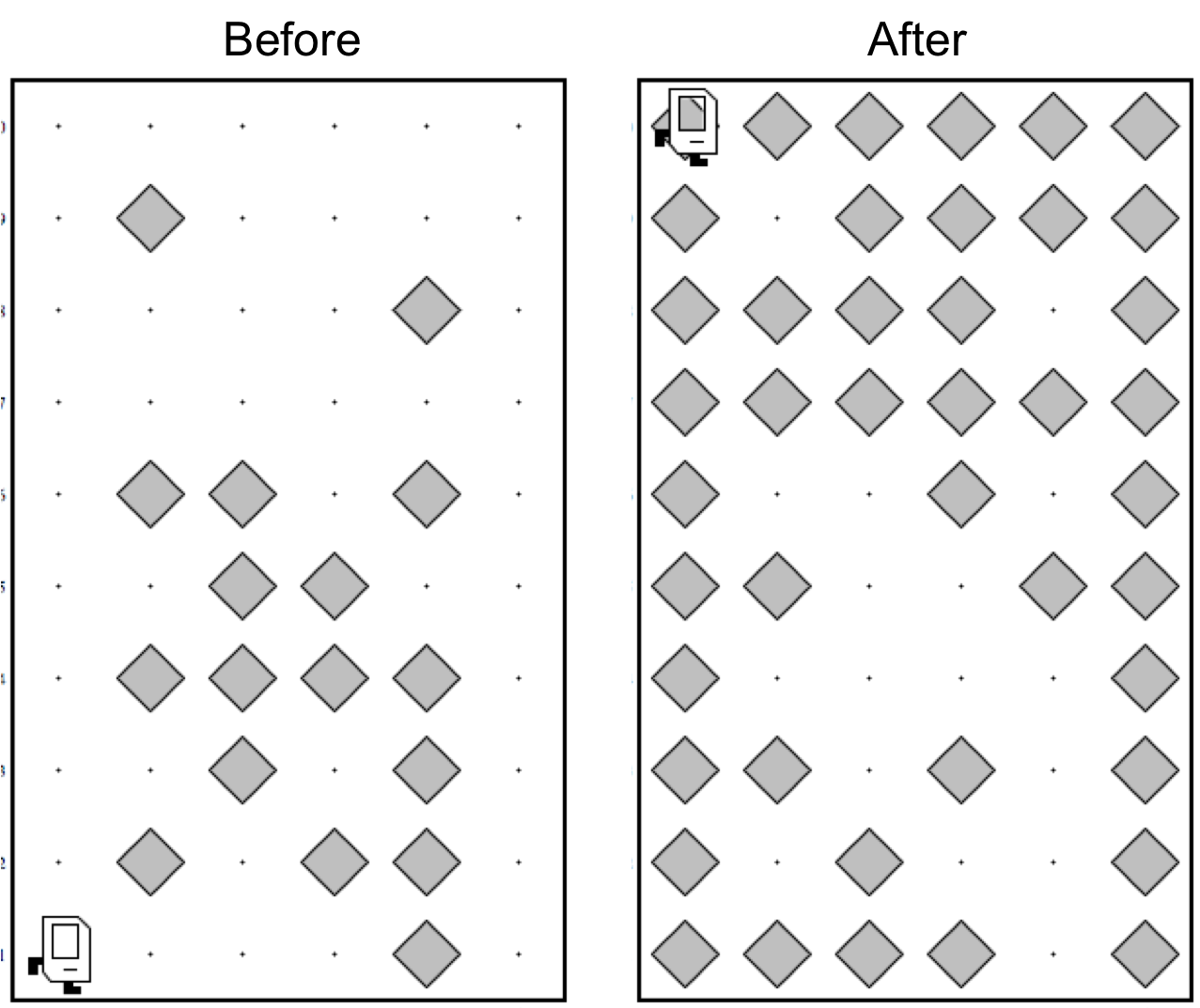 For a world of any size, with any configuration of beepers (no square will have more than one), invert all the beepers so that, where there was a beeper previously there is no beeper... and where there was no beeper previously, there is a beeper. Consider the following example.