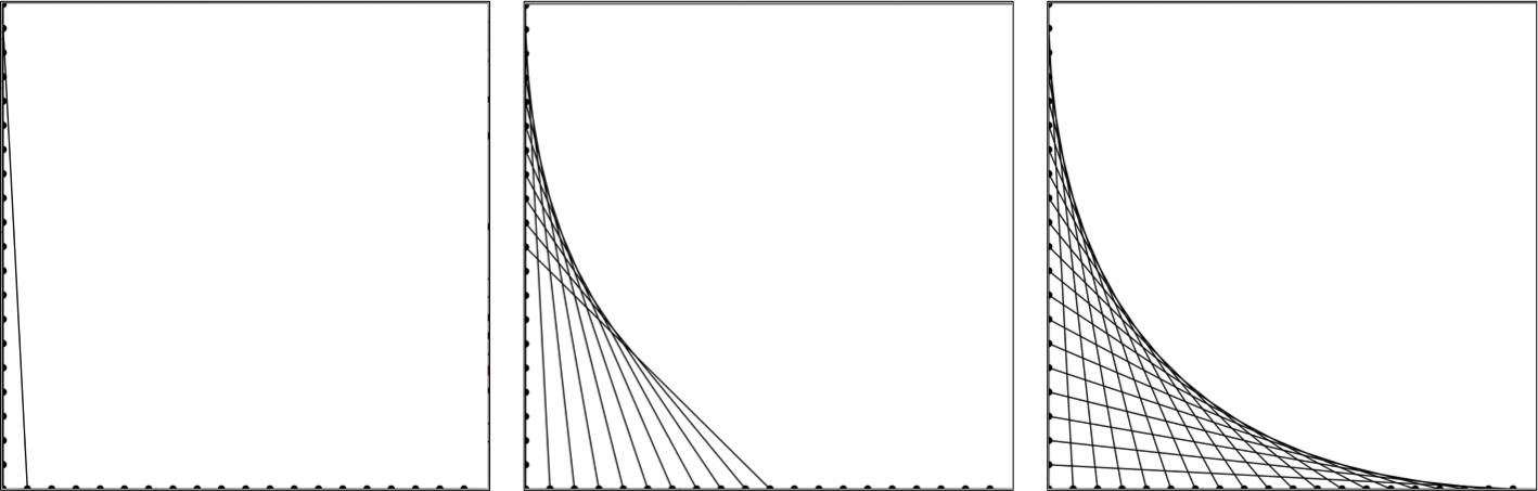 By repeatedly drawing lines, we can make a curved looking shape. Consider the example below where we imagine dots evenly space along the bottom and the left of a canvas. If we connect the topmost dot on the left edge to the left most dot on the right edge, we would be a line like the picture of the far left. If we then connect the next 10 dots we get a picture in the middle and if we connect all dots we get the picture on the right.