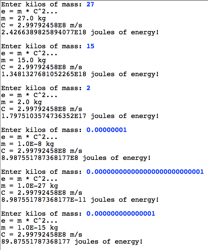 Write a program that continually reads in mass from the user and then outputs the amount of energy. Show your work in the following way:
