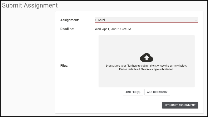 Figure 2: When you select an assignment from the dropdown menu, the page presents you with a file selection area. You can drag your files there or use the "Choose File" button.