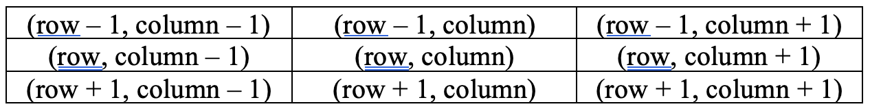 To be explicit, the color in pixel (at location (row, column)) in the new image should be the average of the colors in the sub-grid of the original image defined by the pixels with indexes shown below: