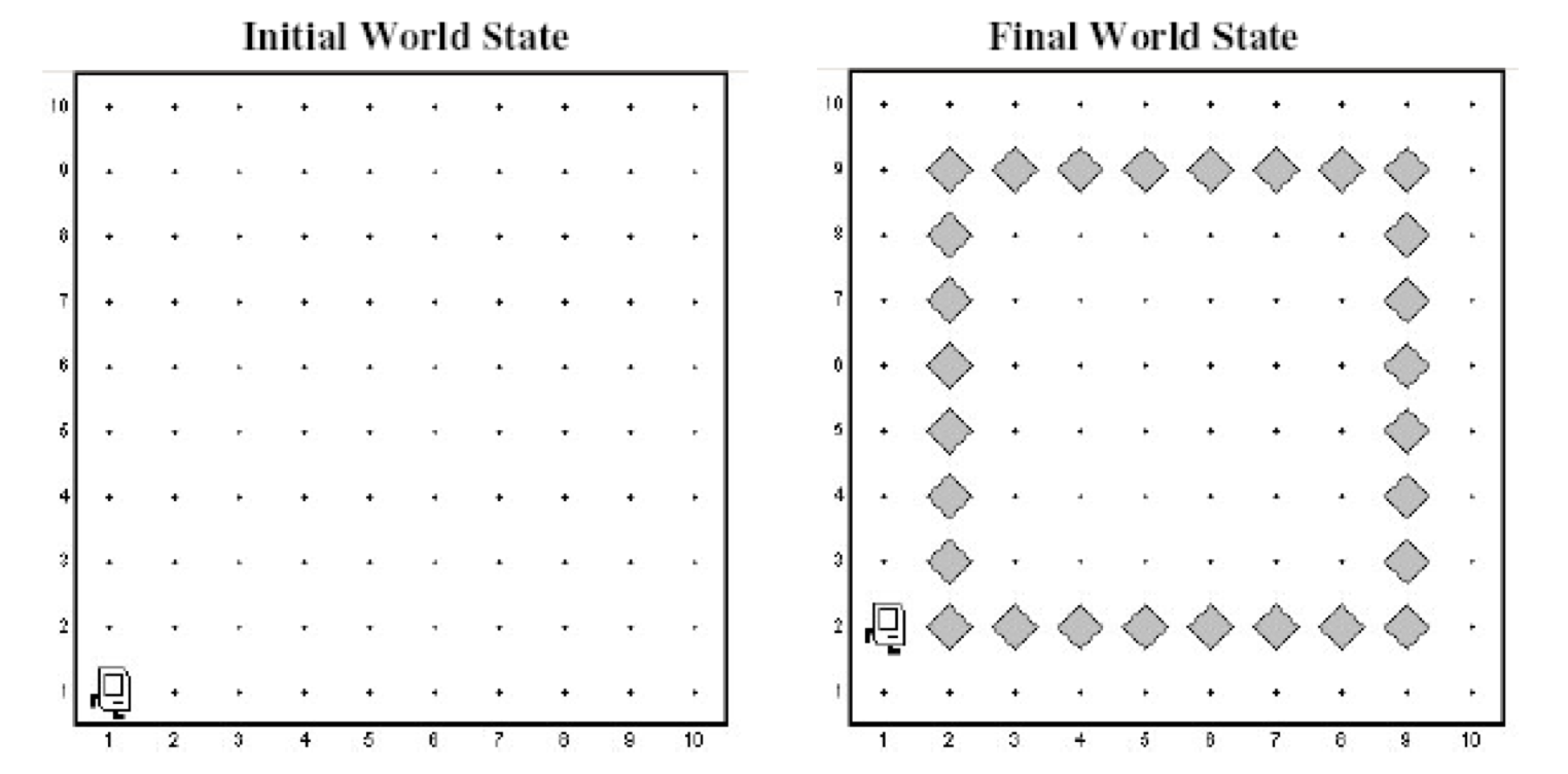 We want to write a Karel program which will create an inside border around the world. Each location that is part of the border should have one (and only one) beeper on it and the border should be inset by one square from the outer walls of the world like this: