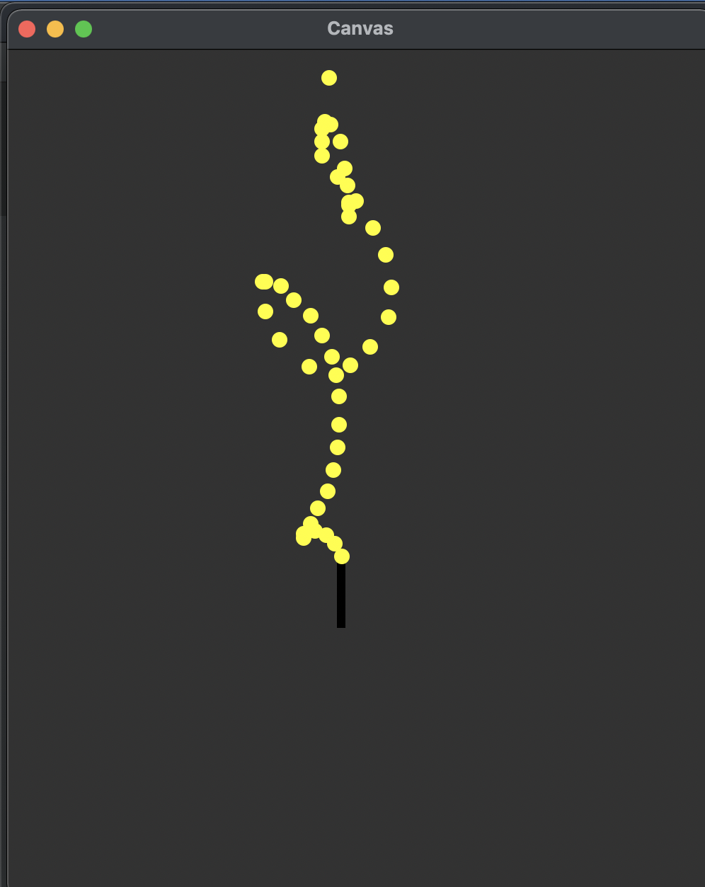 To simulate a magic wand on the cursor, we will draw a black rectangle that follows the user's cursor and emits yellow sparkles (circles) that float upwards. The bottom right corner of the magic wand is attached to the mouse, and this wand is a black rectangle with dimensions WAND_WIDTH by WAND_HEIGHT. Every timestep, a yellow circle with radius SPARKLE_RADIUS should appear at the top center of the wand, and move upwards with velocity SPARKLE_Y_VAL. Note that this velocity is just the magnitude, so to make the sparkles move upwards, you should move them in the negative velocity. You should write your code in an animation loop, so that the wand and sparkles continue moving around the screen at each timestep, with a delay of DELAY seconds. It's fine to have the sparkles move off of the screen; you don't need to do anything special to delete them after they move beyond the edge of the screen. You can start your wand off with its upper left at (0, 0).