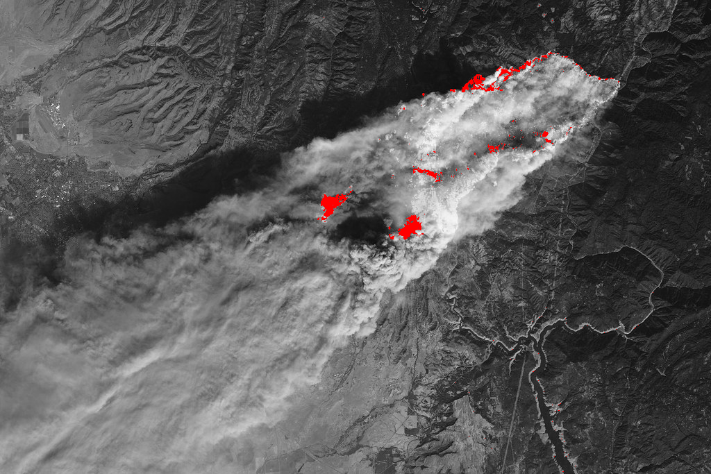 We're going to write a function called highlight_fires in the file forestfire.py that highlights the areas where a forest fire is active. You're given a satellite image of the 2018 "Camp Fire" wildfire in California (credit: NASA), and your job is to detect all of the "sufficiently red" pixels in the image, which are indicative of where fires are burning.