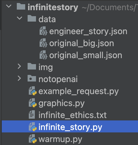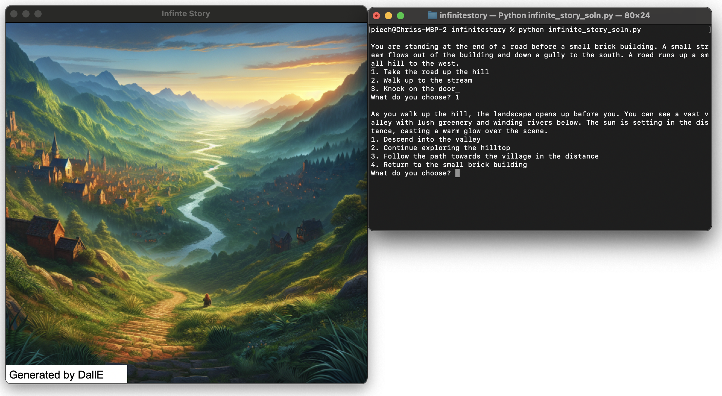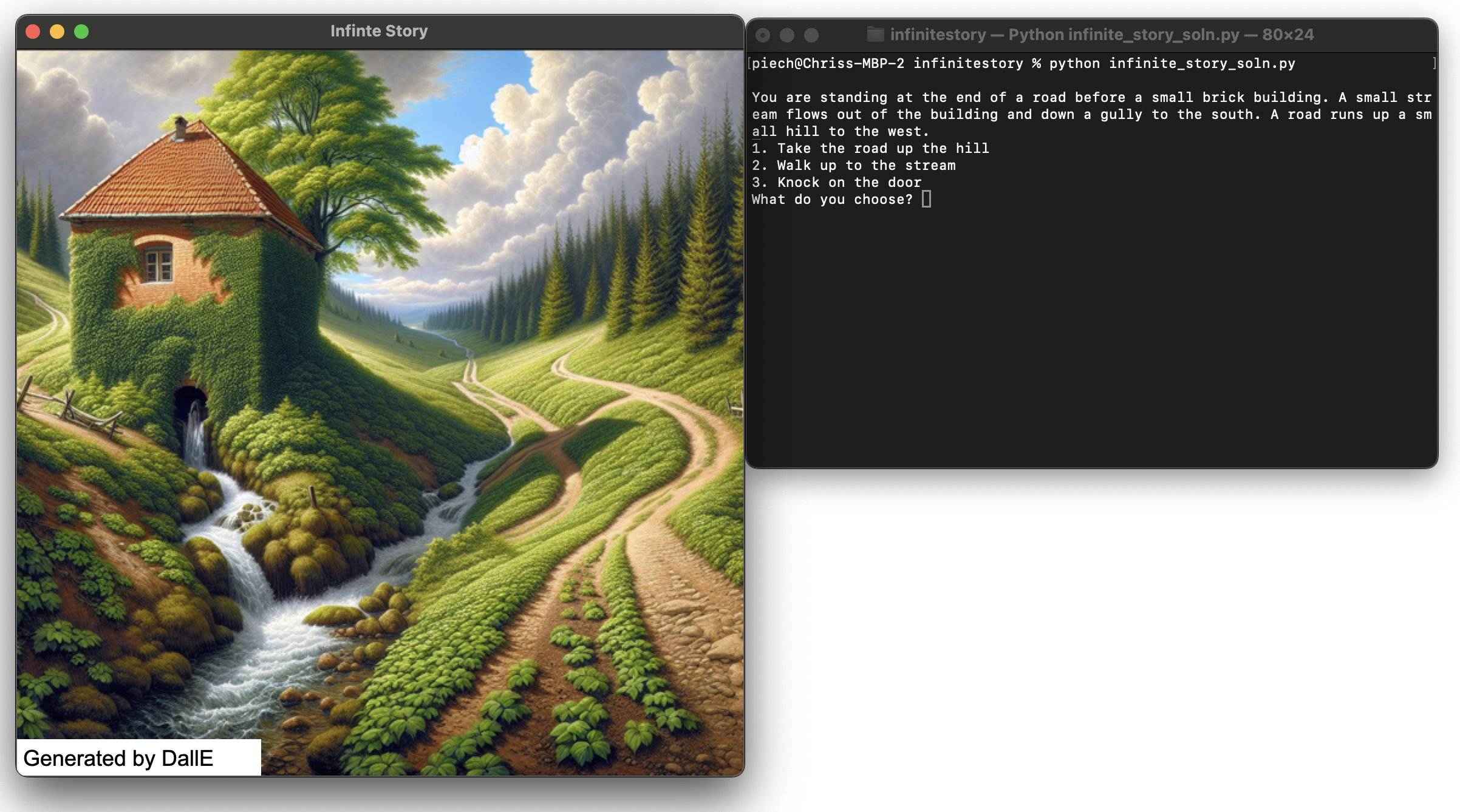 Note: you might need to run py3 infinite_story.py (Windows) or python3 infinite_story.py (Mac) in your PyCharm terminal in order for the images to appear.