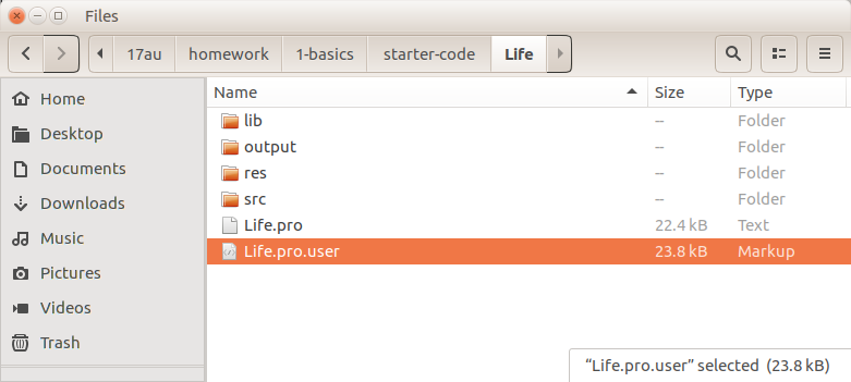 .pro.user, such asLife.pro.userTake care: Delete only the file with exactly thepro.userextension , not the other files such as theLife.pro(screenshot) - Also delete the "build" folder for your project. This is located in the parent directory of your project's directory, and has a long name like