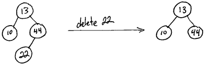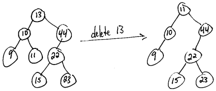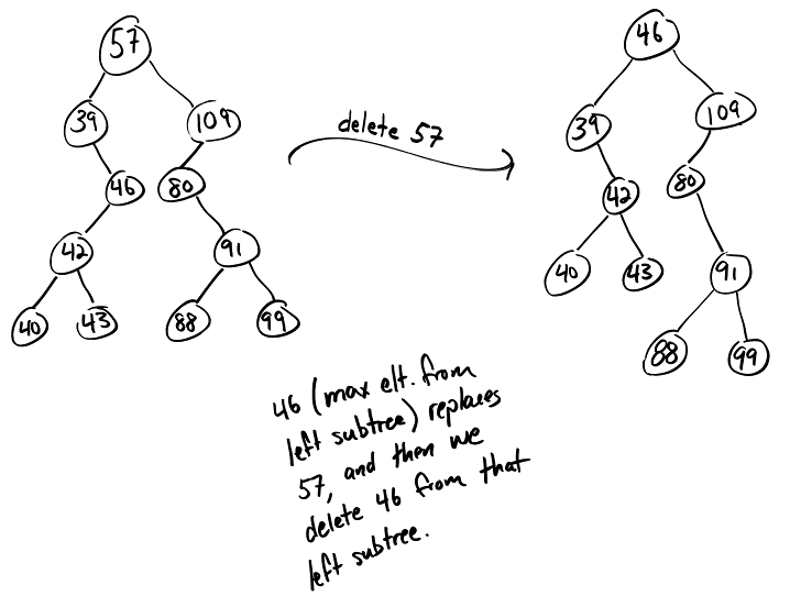 Alternatively, if we delete a node has two children, we could replace the node's value with the minimum value from its right subtree (and then delete that min element from the right subtree). However, for the sake of keeping everything consistent and easy to grade on exams in this class, I always want you to choose option shown in class: use the maximum element from the node's left subtree.