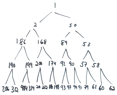 We saw in class that the best-case runtime for deletion is O(1). That happens when the element that we move up to the root position only has to percolate down one level before settling into place. That can happen even if your heap gets absolutely huge. Consider, for example, what would happen if we called dequeue() on the following heap. Do you see the best-case pattern that causes deletion to be O(1)?