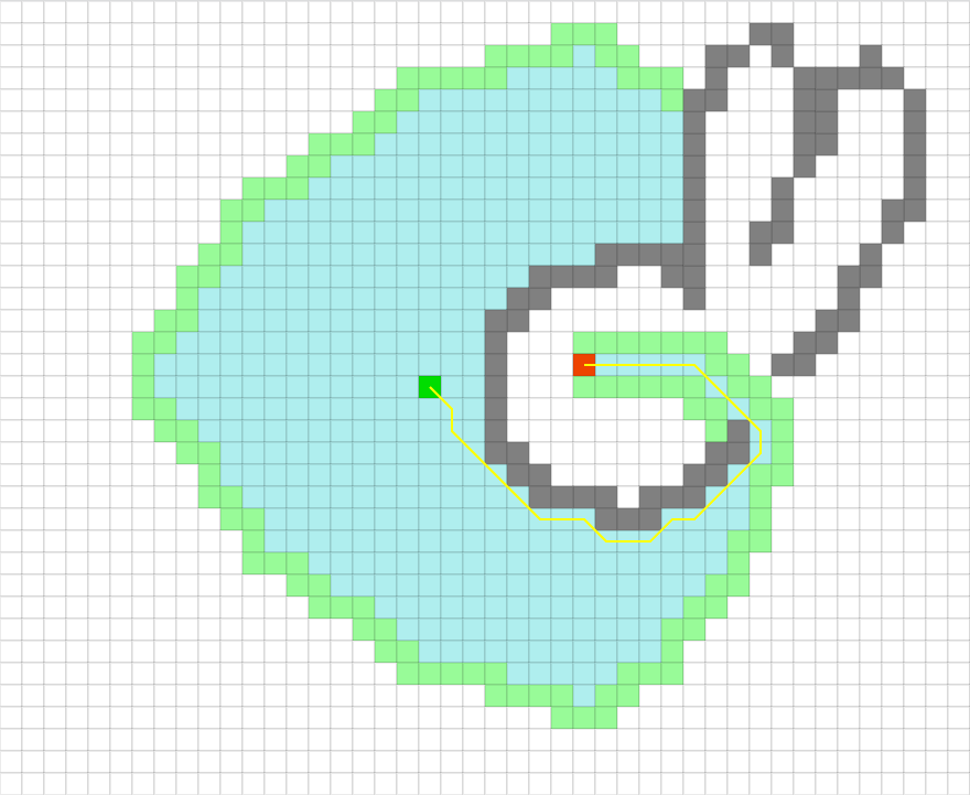BFS is painfully slow in that particular example, and while Dijkstra's algorithm is an improvement, it still explores without any bias in favor of nodes closer to the goal (or against nodes farther away). In the images below, Dijkstra appears very similarly to BFS, but explores the graph in a more radial shape. In the graphs being explored by these algorithms, the nodes represent the large pixels, and the weights of all edges are equal.