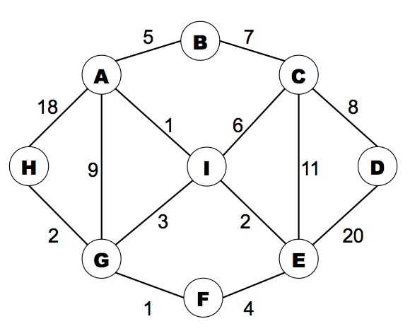 (Important note!) When we say "shortest path" in the context of Dijkstra's algorithm, we're referring to a lowest-cost path -- so, we're taking into consideration not the number of edges in a path (which is our traditional definition of "path length"), but the sum of the weights of those edges. For example, in the following diagram, the shortest path from A to H is not A → H (which has a cost of 18). Rather, it is A → I → G → H (which has a total cost of 6):