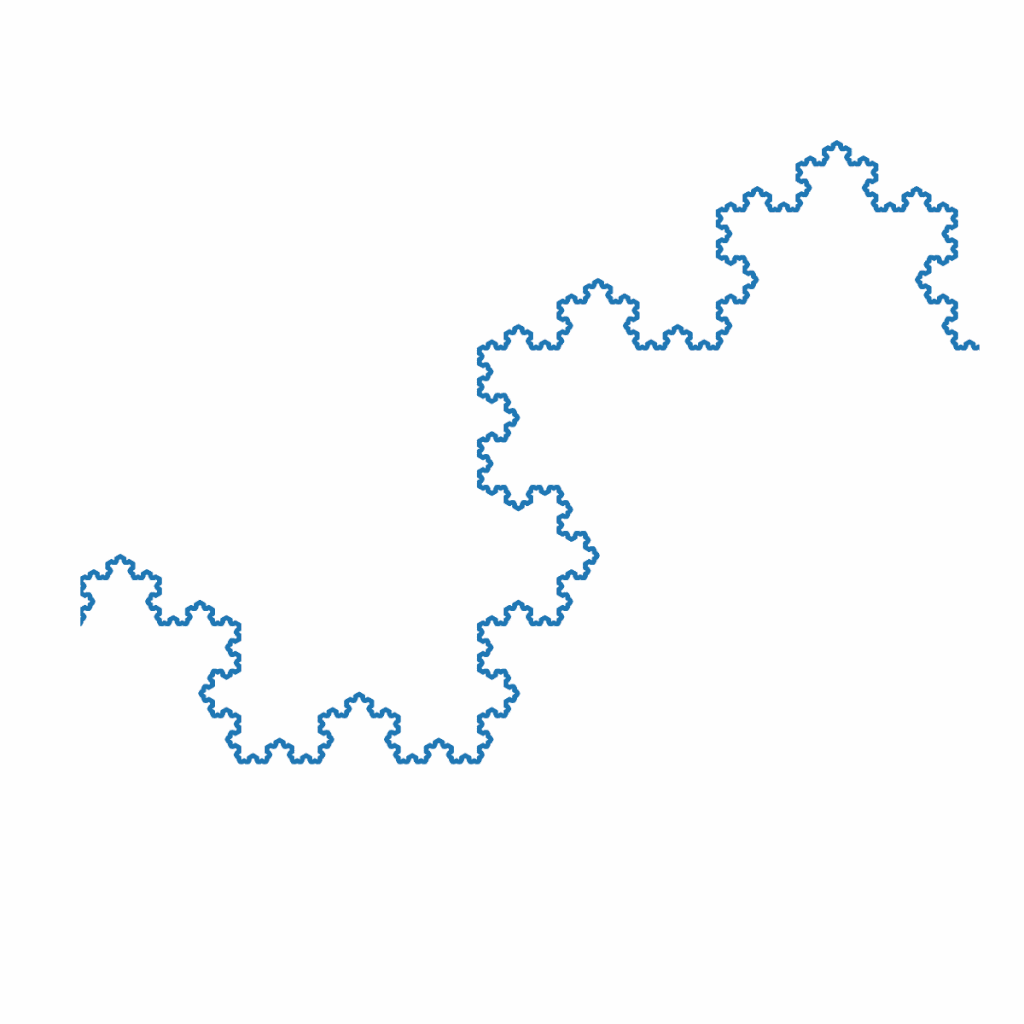 (Important note!) The animation above shows each level of recursive calls in parallel, which gives a high-level overview of the algorithm, but this parallelism does not mirror how the recursive calls would be made in code. In that animation, we initially see the first call to drawSnowflake() dividing a line into four segment. We then see the results of all four recursive calls at once, followed by the recursion into all 16 of the recursive calls that take place at the next level.