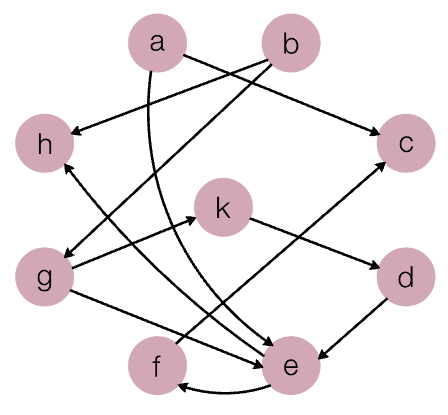 For example, in the graph below, node h has two incoming edges: one from b, and one from e. Accordingly, any valid topological sort for this graph must list nodes b and e before listing node h:
