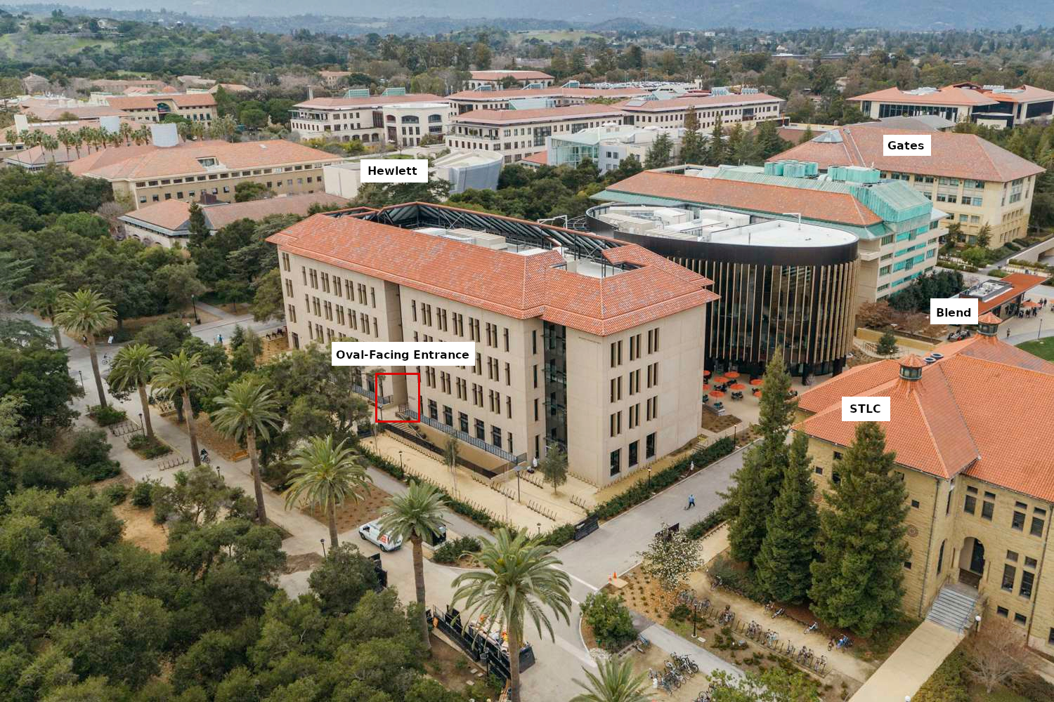 - Entry to CoDa (where we hold LaIR) is restricted after 7 PM, and some doors might actually lock at 5 PM. To gain entry after hours, you need to badge in with your Stanford ID or the Stanford Mobile App using the door on the east side of the building (the side facing the Oval). Here's a map for reference (click to enlarge):