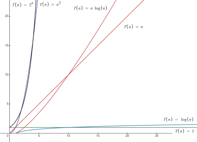 Take that chart with a grain of salt, though. While it shows the relative ordering of those runtimes and loosely conveys the shapes of those curves, it does not accurately represent the vast disparity between some of them or the immense closeness of others. For example, if you were to go to an online graphing calculator, have it graph all of the following functions: