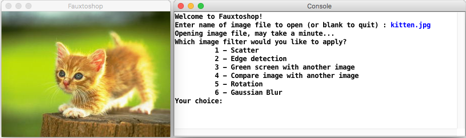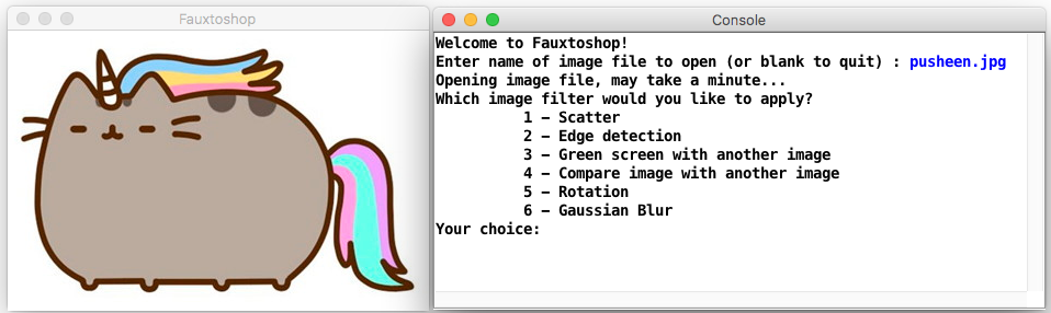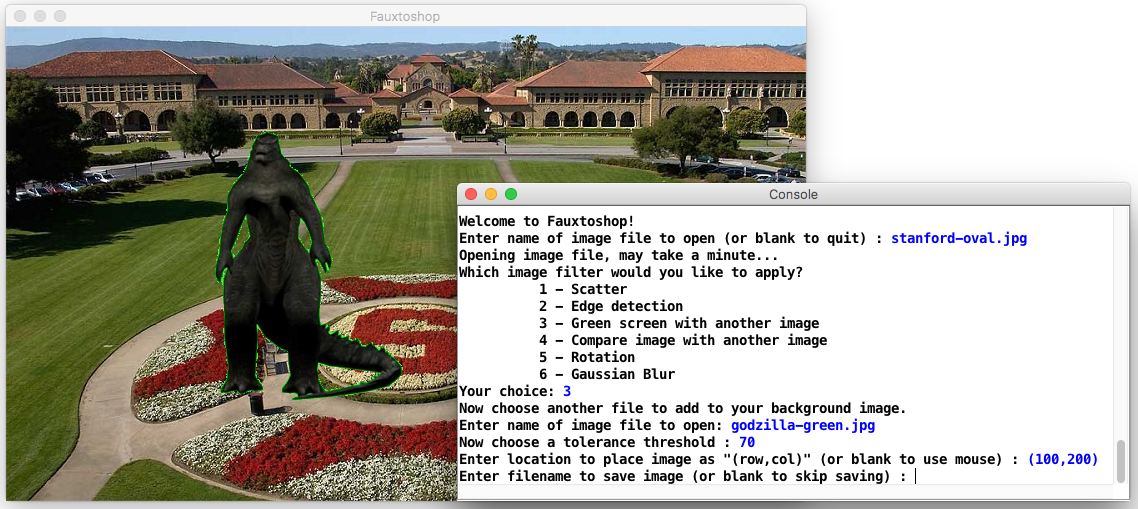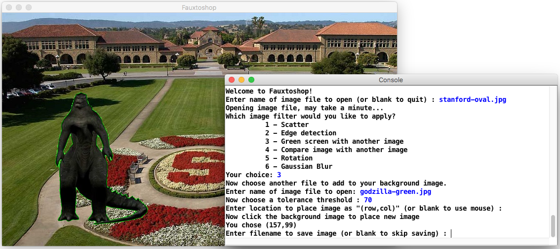 You'll notice there are two windows: Console and a Fauxtoshop window. In the screenshots throughout this document, you will see that what you should print in the window labeled “Console” is in black font, and what the user types is in blue font. The “Fauxtoshop” window is created using the Stanford library graphics class GWindow (refer to Stanford library documentation). Very important note: your program should only ever declare and use one GWindow, and its lifespan should span the entire duration of the program, or else your program may crash. We have declared one in main for you in the starter code, thereby making its lifespan the duration of the program. You should not edit the main code or make other GWindow objects.