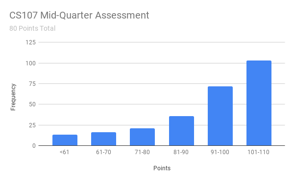 The mid-quarter assessment is intended to gauge your comfort and facility with the course material so far. Since the course topics build on each other, confirming you have a solid grasp of the foundational material now ensures you are equipped to tackle the later concepts to come in the course.