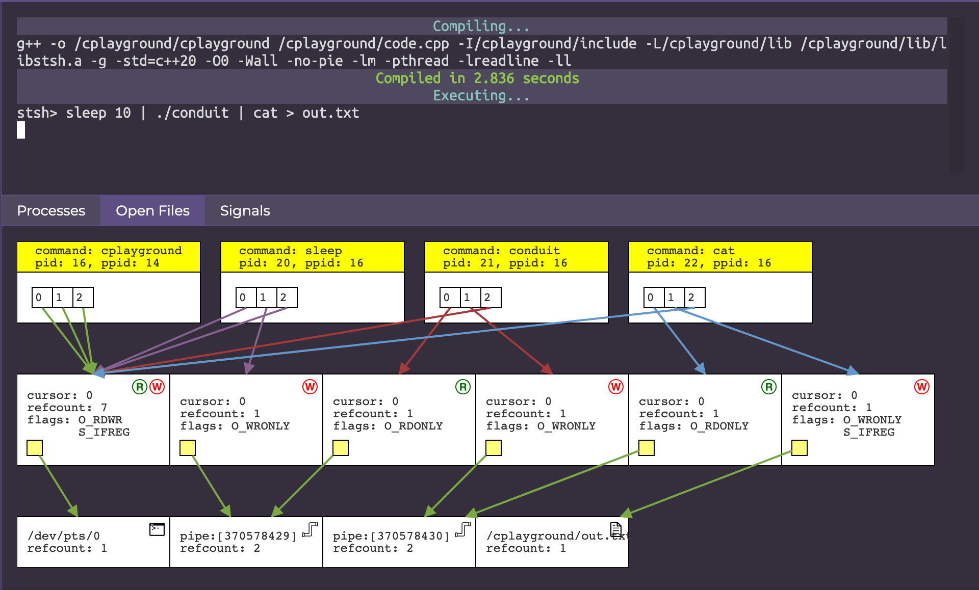 Here is a cplayground with the starter code. This may be helpful for debugging file descriptor wiring, and there’s a chance it might help for debugging signals.