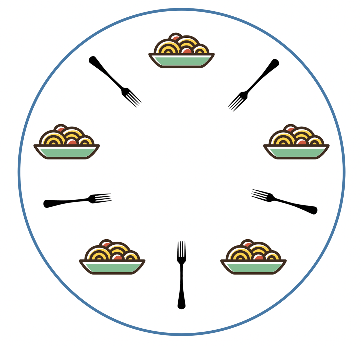 Five philosophers sit around a table with an enormous plate of spaghetti on it. There is a fork in between each philosopher (for a total of five forks). Each philosopher thinks for some time, then grabs both forks surrounding him – one on his left, one on his right – and starts eating, then puts them back and goes back to thinking.