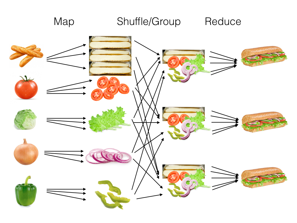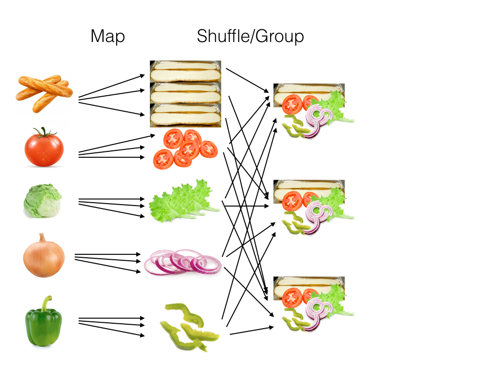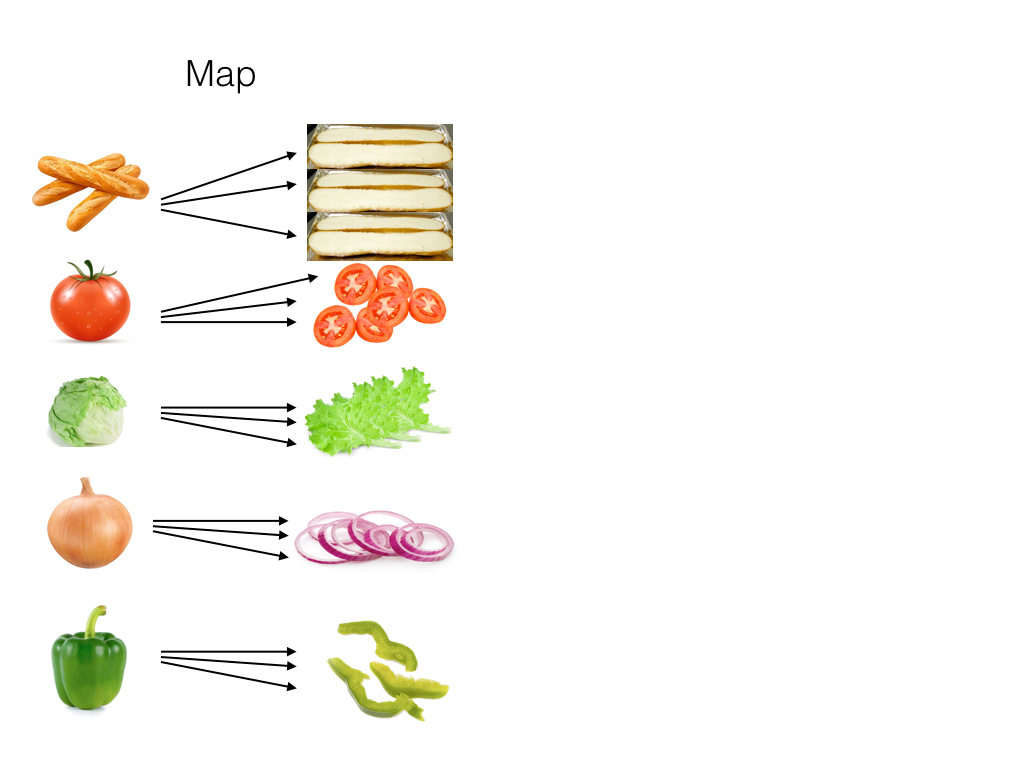 First, we distribute our raw ingredients amongst the workers in our shop. One person takes the tomatoes, one person takes the lettuce, one person takes the onions, and so on. We’ll call this the “map” stage.