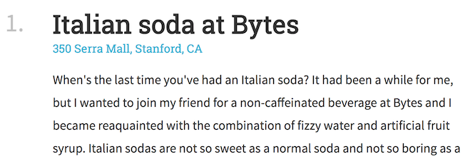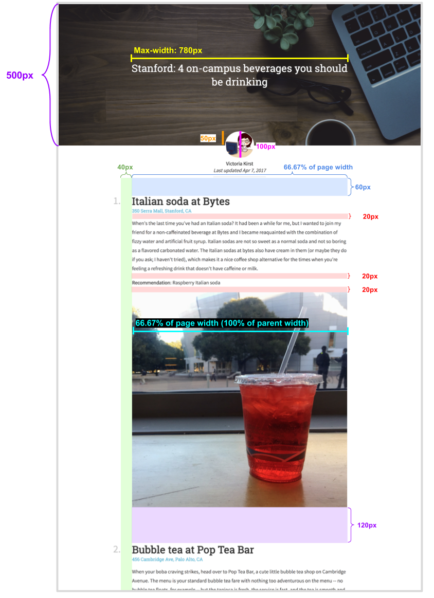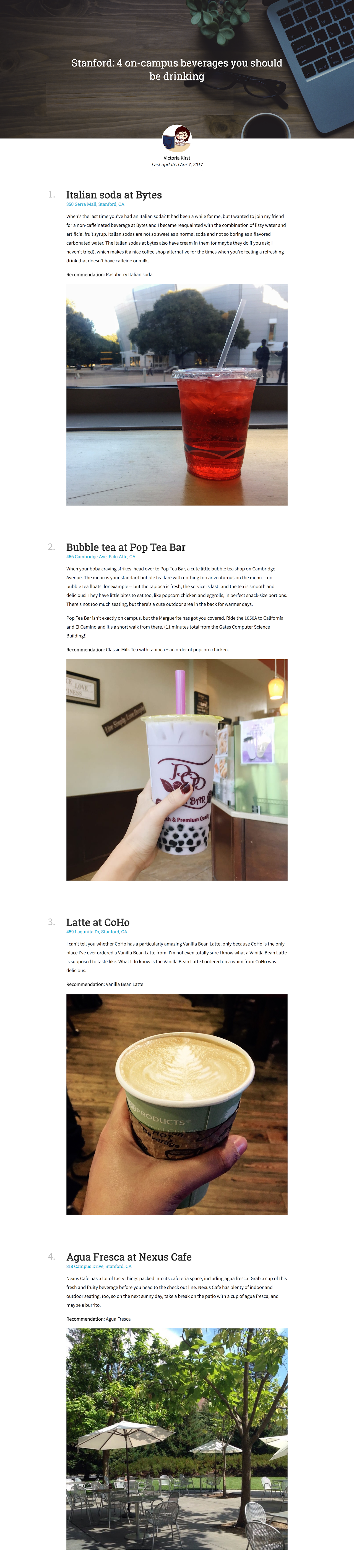 For Part 1, you will create a listicle web page that describes the “4 on-campus beverages you should be drinking” at Stanford. You should create the web page in listicle.html with styles defined in listicle-style.css.