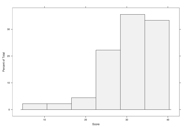 The exam was 40 pointer (8 out of 10 questions). The average on the exam was around 27 points, with a standard deviation around 6 points. A more detailed distribution is available here.
