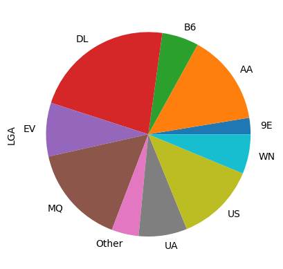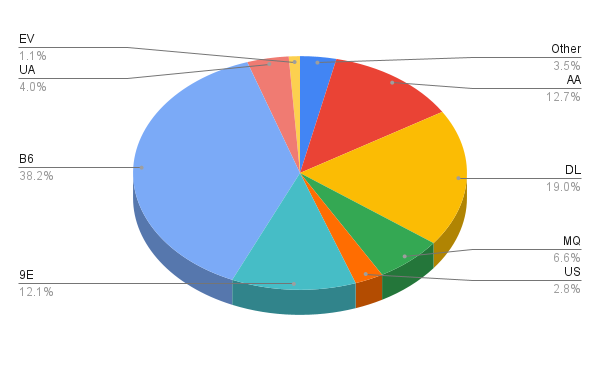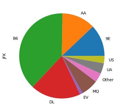 Here is a pie-chart showing the distribution of carrier for the flights that left from JFK airport