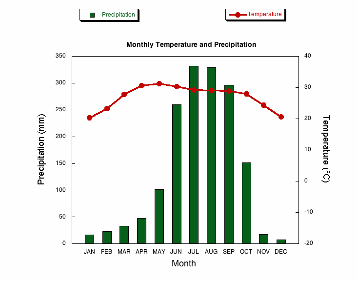 Sometimes line charts and bar charts are combined in a single visualization, as in the following climograph (of Kolkata, India), a visualization of a location’s basic climate.