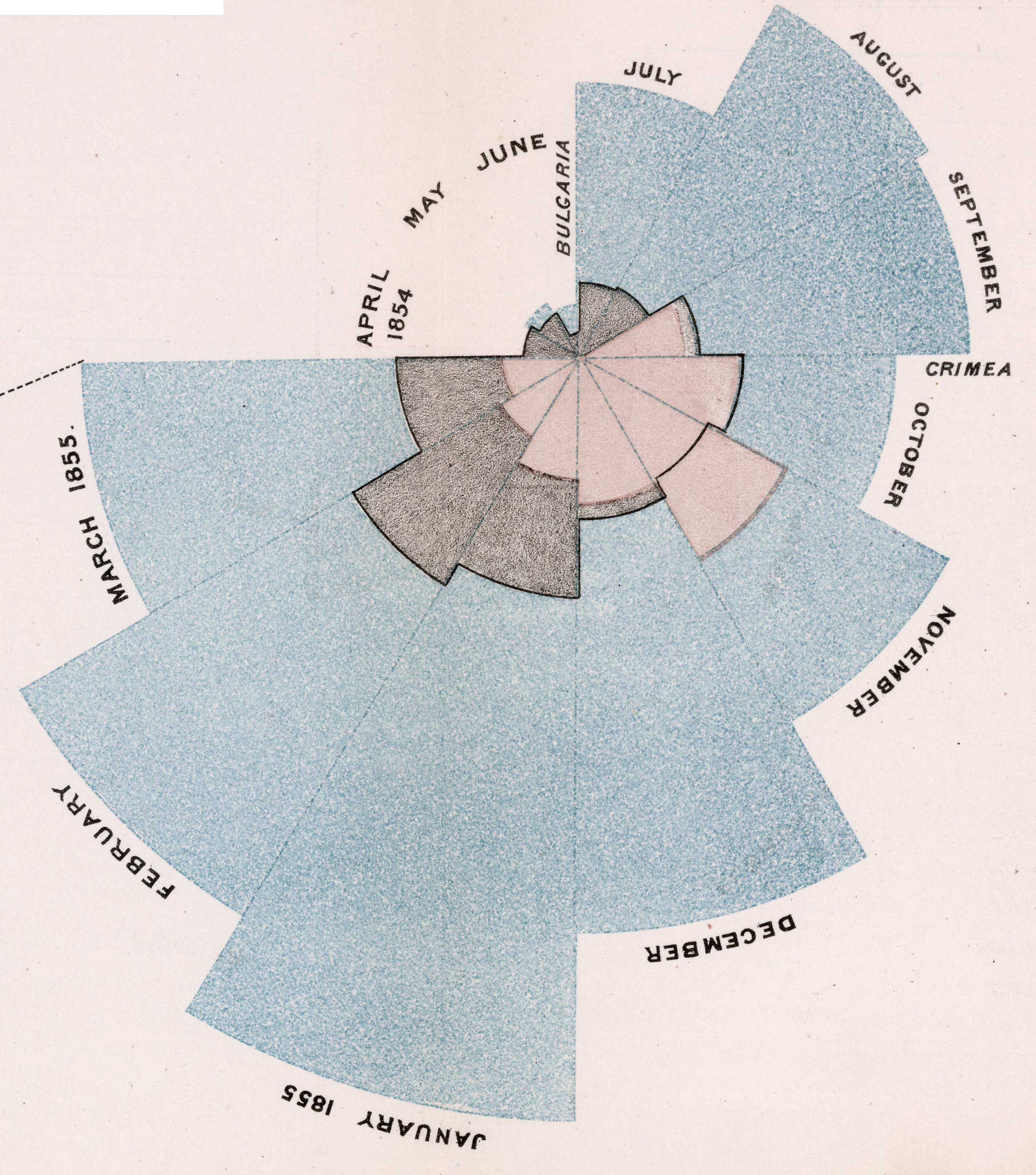 She drew public attention to the importance of nursing by making visualizations, such as the one on the next slide, which depicts deaths during the Crimean War.