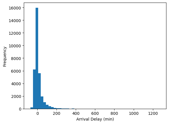 Shown below is a histogram of the arrival delays from the flights data.