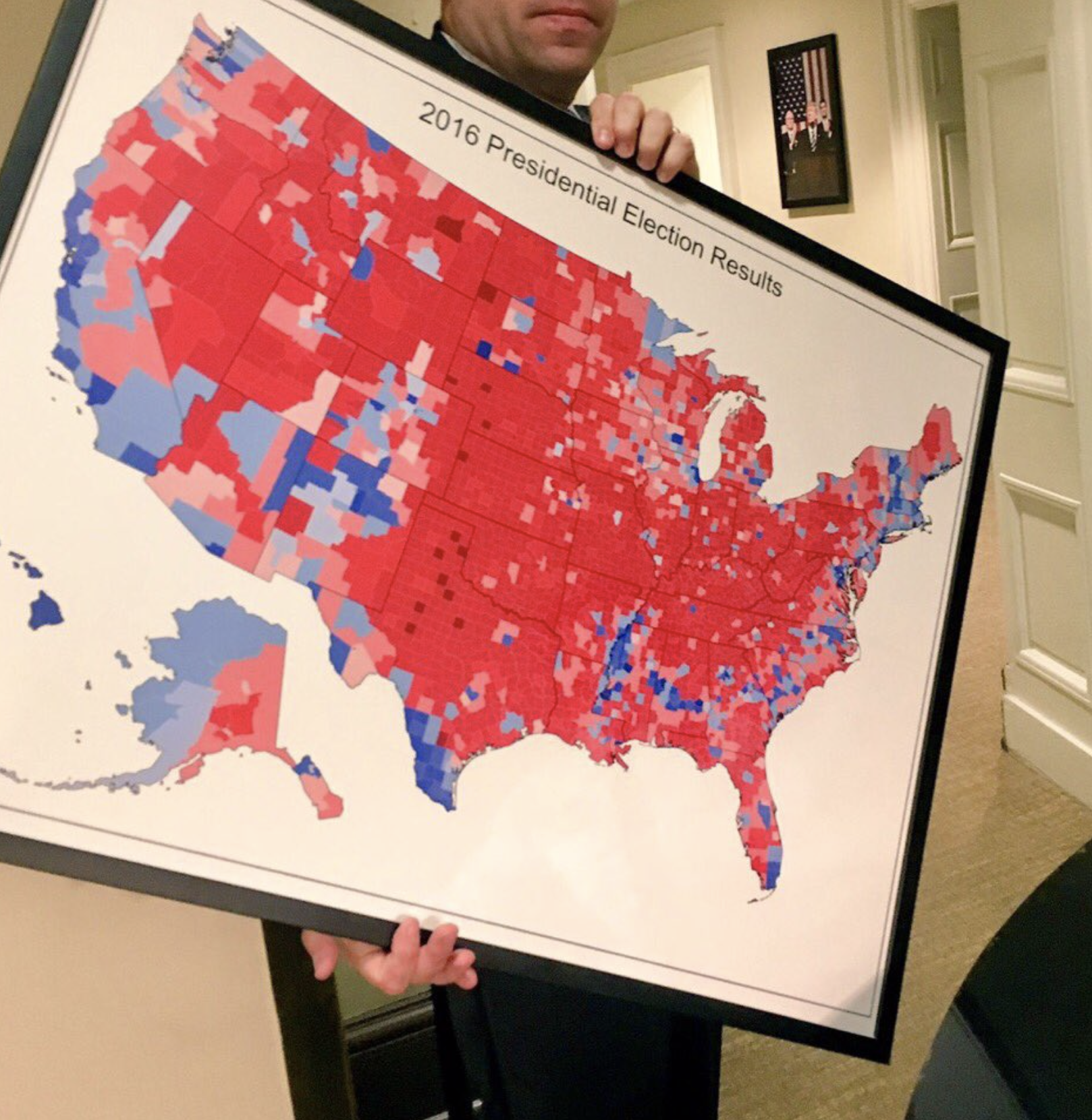 “Oh I love those beautiful red areas, that middle of the map. There’s just a little blue here, and a little blue, everything else is bright red.” —Donald Trump