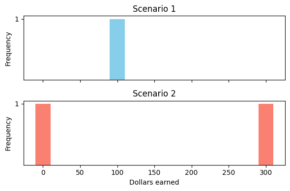 Scenario 2 is a distribution with two datapoints: $0 (tails), $300 (heads)