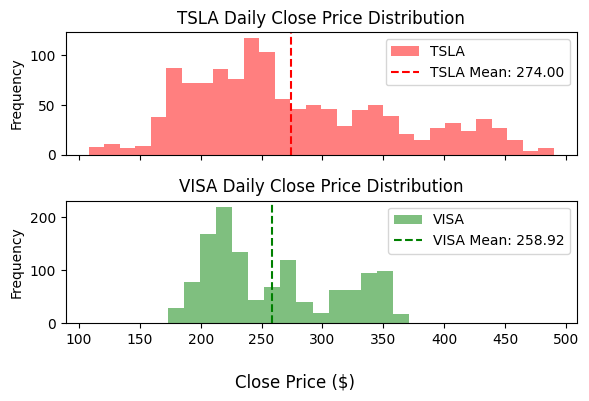These histograms show the daily closing prices of Visa (VISA) and Tesla (TSLA) stock for the last 5 years.