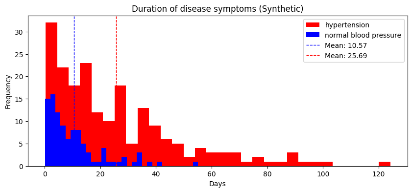 But suppose we separately analyze the data for patients with and without hypertension; in that case, we see that the average duration of symptoms for patients without hypertension is much shorter: