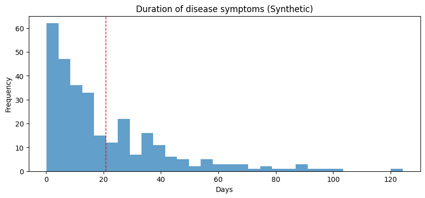 A medical researcher at a hospital records the duration of symptoms for a new disease.