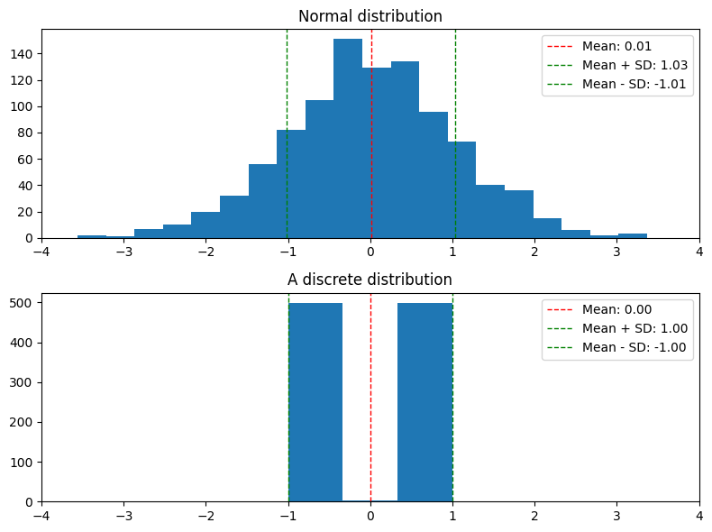 Two different distributions with (almost) the same mean, median, and standard deviation.